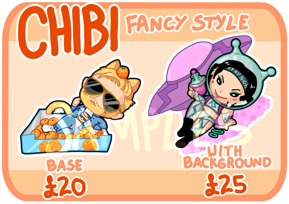 Full colour chibi drawings of a single character/person with coloured lines and an optional background design with limited rights to use commercially for merch purposes.*Can add another character for £10Order via Ko-fi by clicking the button below.